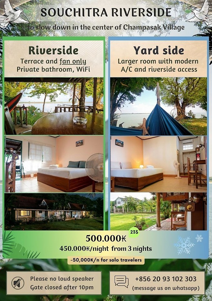 We (2 friends) took over and renovated Souchitra from beginning of 2023, we've been living here ever since (see our story). Champasak village is a good fit for travelers looking to slow down, an hidden paradise with everything needed to live peacefully 🕊️